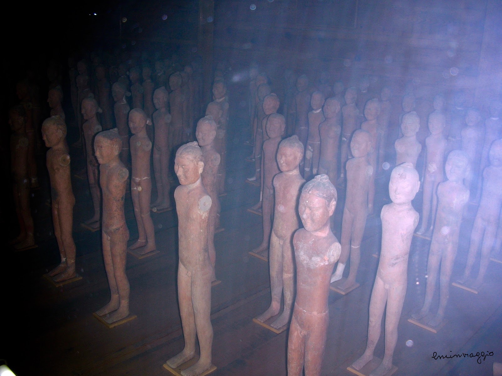 Le statuine sono nude e senza braccia, perché gli abiti in stoffa e gli arti, che erano mobili e realizzati in legno, col passare del tempo si sono dissolti. Alcune statuette hanno tracce di colore, lasciate da sciarpe di seta rossa. Tutte le sculture sono costruite rispettando le proporzioni e curando meticolosamente i dettagli; questo valorizza l’abilità artistica di chi le ha eseguite. In alcuni punti si cammina sul vetro (con copriscarpe di plastica) e, al disotto si vedono gli scavi. E’ inestimabile questa scoperta, perchè aiuta a conoscere culturalmente le abitudini di popoli ormai scomparsi.
